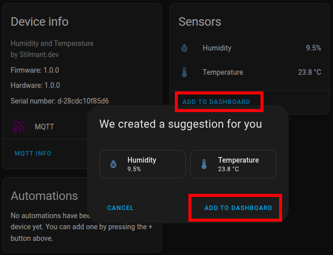 Thanks to MQTT discovery, Home Assistant handles everything else automatically. The device shows up in HA, and you can add the sensor data to your dashboard in just a few clicks.