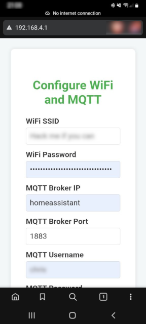 http://192.168.4.1. - Fill in your Wi-Fi and (optional) MQTT credentials, hit save, and it reboots.
